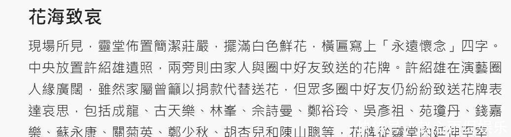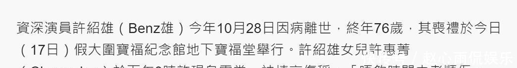 11月17日,家人为许绍雄举行了灵堂布置,凭着他生前在娱乐圈的人缘,许多明星都纷纷赶到现场,陪他走完最后一程,表达自己的怀念之情。
